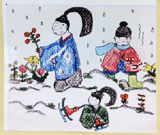 あなたにあげるために 春の野に出て若菜を摘む私の袖に しきりに雪が降りかかってくる