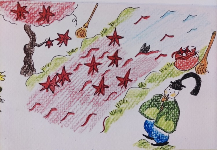 あわただしさにまぎれ ぬさ(お金)の用意のないまま旅に出て 途中たむけやまじんじゃに立ち寄りました 紅葉があまりにもつややかなので幣の代わりに一枝 神のみごころに捧げ 旅の安全を祈ります